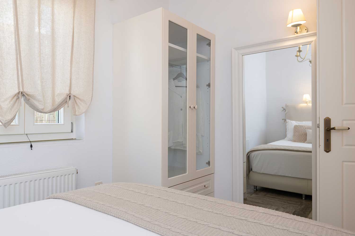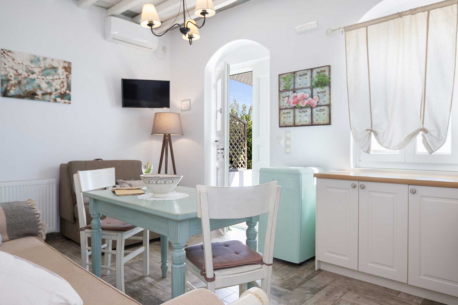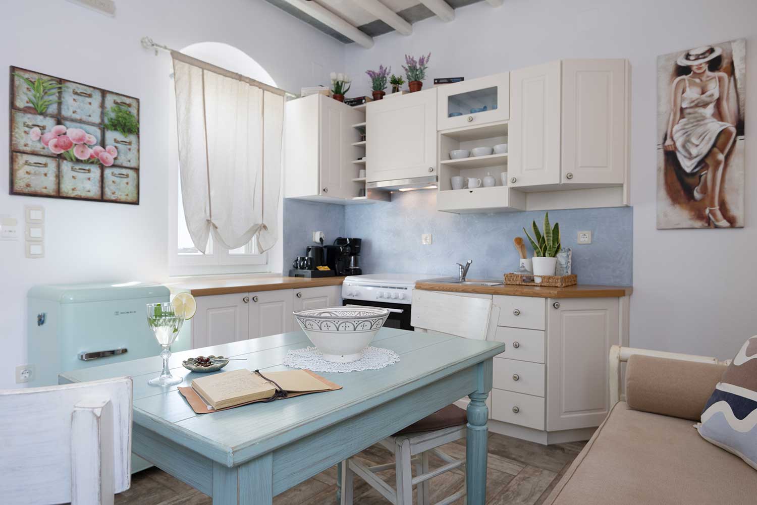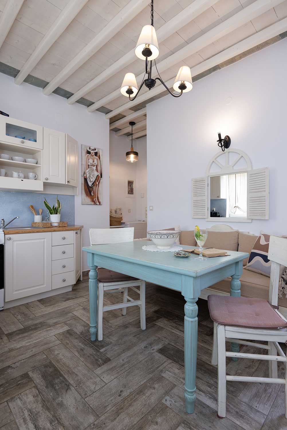 Το διαμέρισμα Ερωφίλη συνδυάζει κομψότητα, άνεση και ρομαντική ατμόσφαιρα. Η φωτεινή κουζίνα με τις παραδοσιακές πινελιές και η άνετη τραπεζαρία δημιουργούν έναν ζεστό χώρο για στιγμές χαλάρωσης, ενώ το υπνοδωμάτιο με τις γήινες αποχρώσεις προσφέρει απόλυτη ηρεμία.
